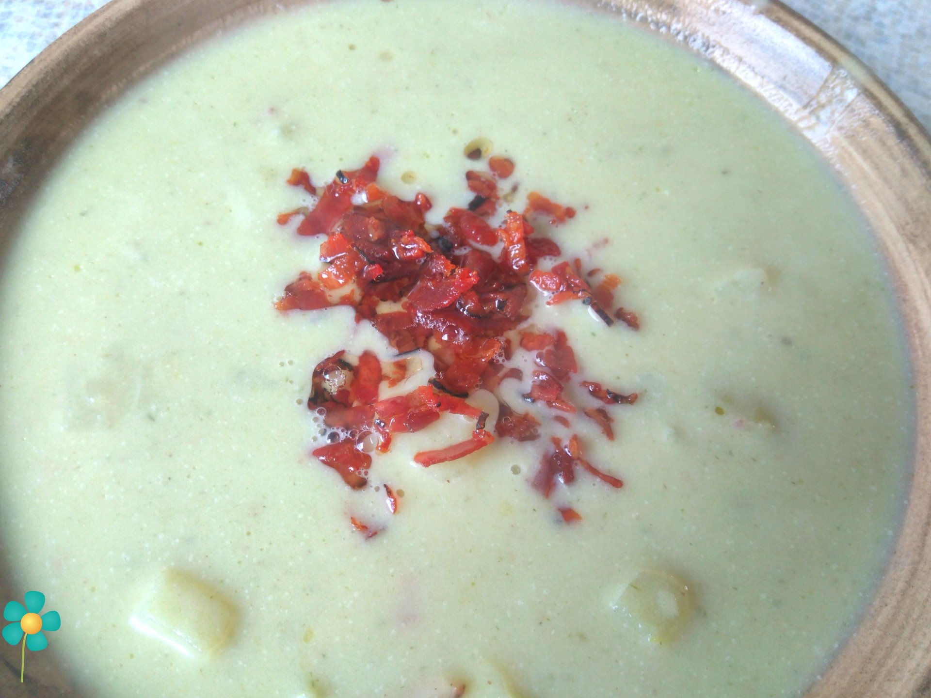 Orestujte dokřupava slaninu pokrájenou na proužky/kostičky a hotovou polévku jimi ozdobte a ihned podávejte.