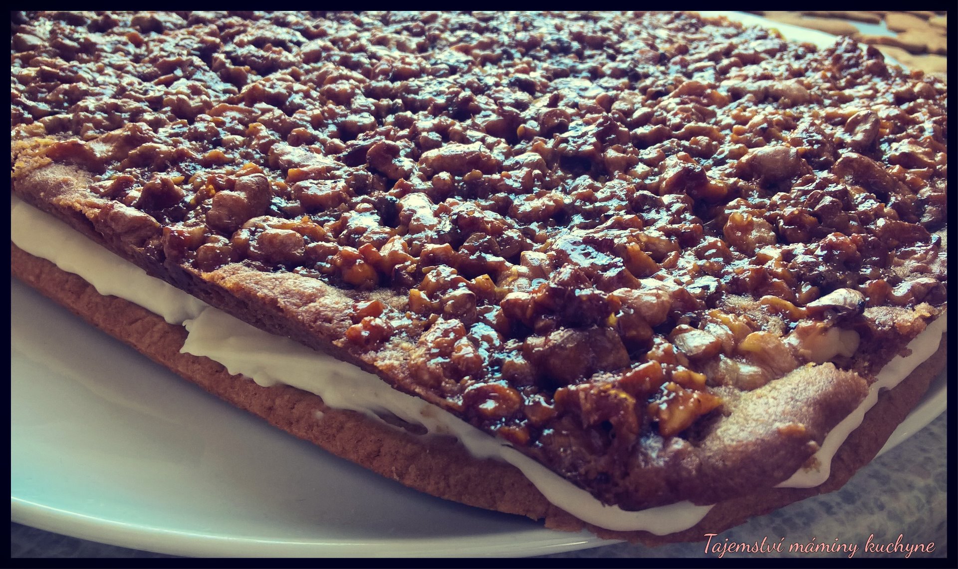 Zcela vychladlou placku bez náplně lehce pokapejte rumem, nechte ho vsáknout a pak placku rovnoměrně potřete krémem a zakryjte druhým vychladlým plátem s ořechy. (S pláty upečeného těsta se manipuluje tím lépe, čím jsou chladnější. Před konečným sestavením moučníku je proto můžete dát vychladit do lednice.) Nechte odležet do druhého dne.